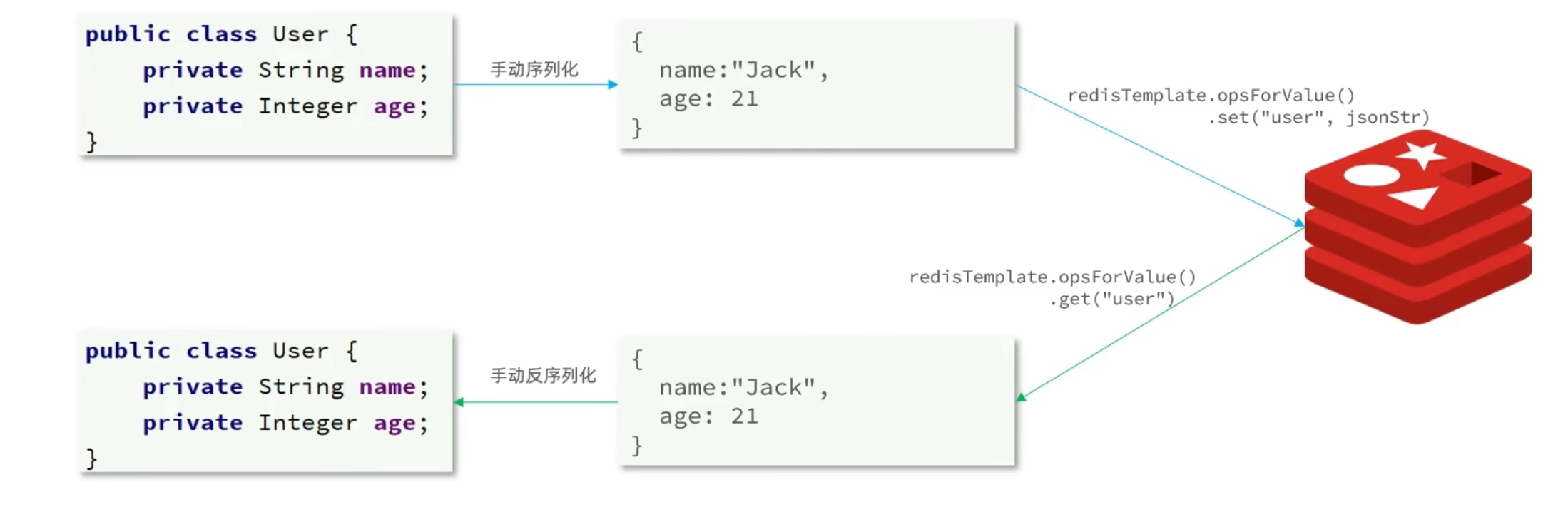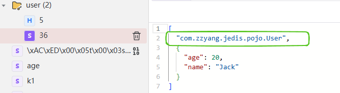 @Test void testSer() { redisTemplate.opsForValue().set("user:36", new User(20, "Jack")); User user = (User) redisTemplate.opsForValue().get("user:36"); System.out.println("user = " + user); }