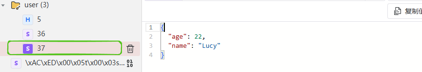 @Test void testStringTemplate() { User user = new User(22, "Lucy"); stringRedisTemplate.opsForValue().set("user:37", JSON.toJSONString(user)); String resUser = stringRedisTemplate.opsForValue().get("user:37"); User userObj = JSON.parseObject(resUser, User.class); System.out.println("userObj = " + userObj); }此时存储的内容没有之前的class信息,节约了存储空间